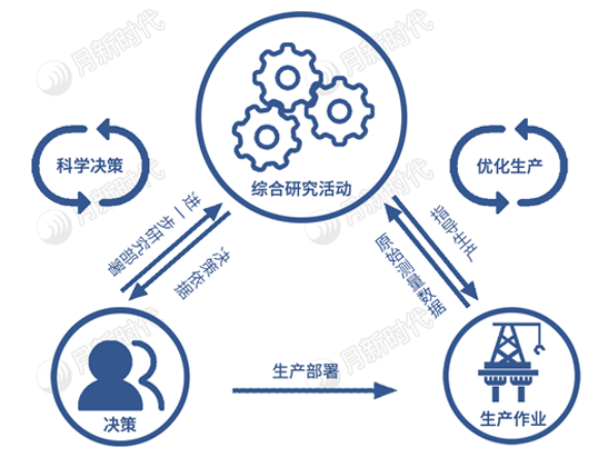 勘探开发研究工作是研究人员利用各种资料、各种软件工具反复求证的过程, 研究工作是整个勘探开发生产流程循环发起点也是核心部分,研究的成果决定着决策及生产活动, 生产活动产生的数据又需要综合研究来总结和验证,并影响进一步决策和生产活动。因此,研究活动具有对数据资源及软硬件要求高、 流程灵活多变、与决策及生产活动结合紧密的特点。